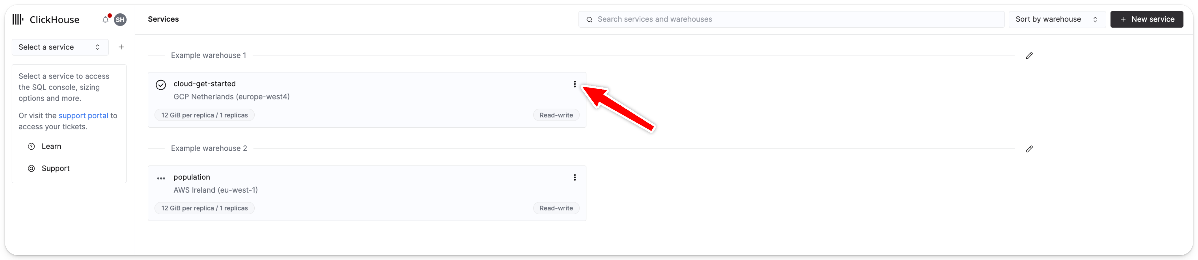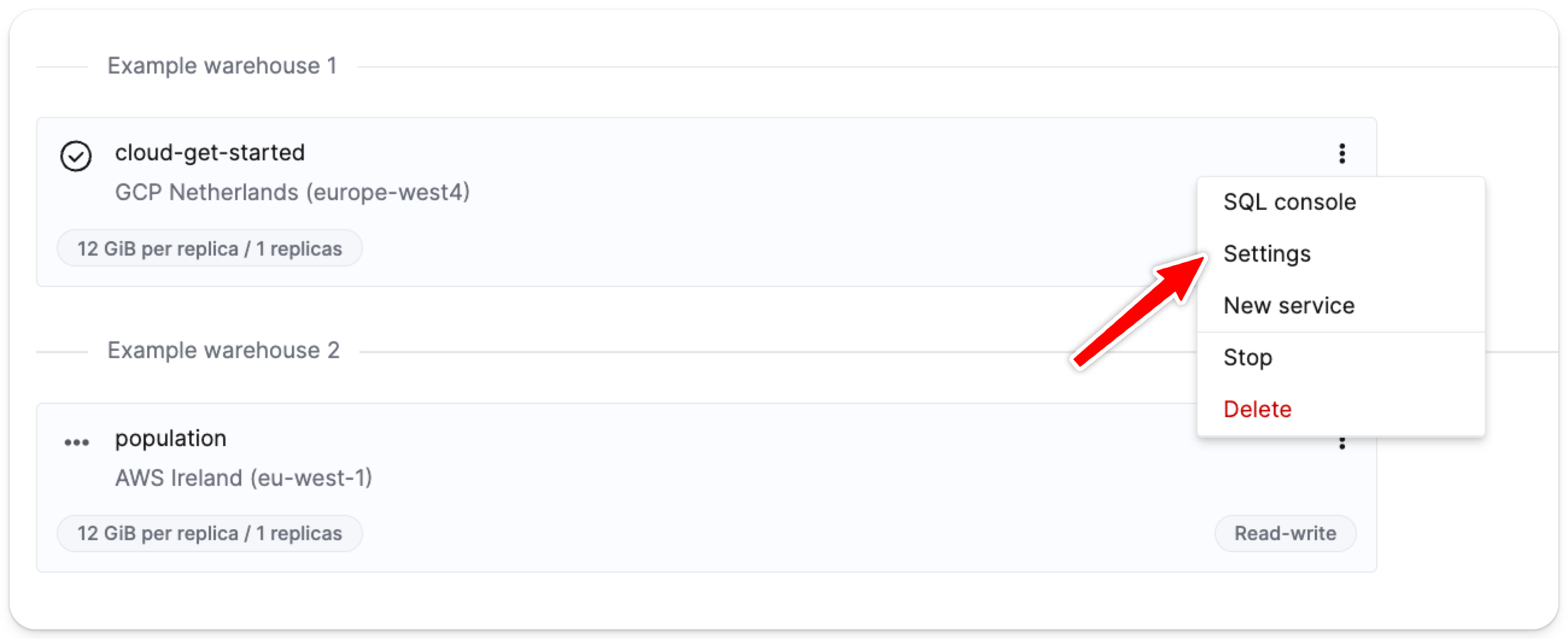 На странице сервисов нажмите на меню в правом верхнем углу карточки того сервиса, для которого вы хотите изменить настройки доступа к SQL-консоли.