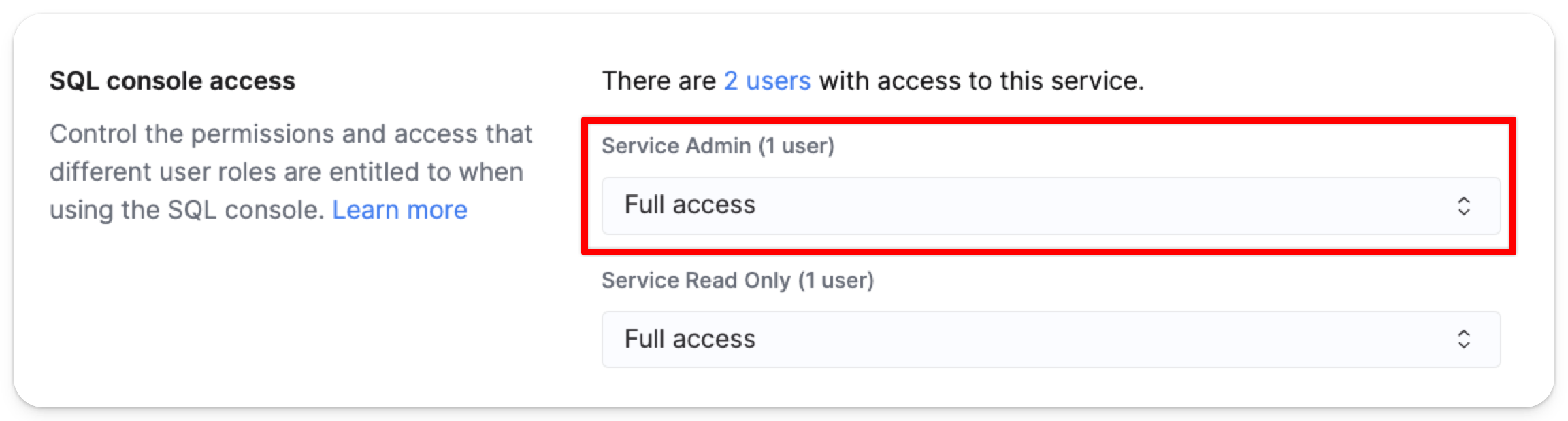 Выберите раскрывающееся меню для Service Admin, чтобы изменить настройки контроля доступа для ролей Service Admin: